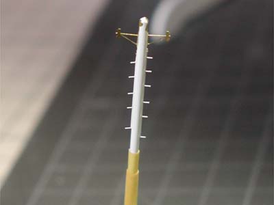 | 手すりで幅の違うところを選んで(→) | あえて左右にずらしてメインマストに接着します |