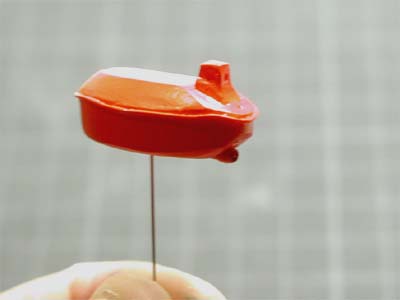 | 蛍光オレンジ+オレンジのツヤあり塗装 | 船体の青ラインのマスキング吹きも終え、いよいよ・・・ |