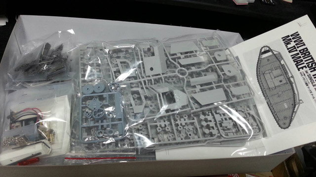 | 2014年6月某日、何の前触れもなく自宅に荷物が届きました。 「ん? タミヤからだ・・・? え? まさか・・・?・・・あ〜っ!!!!!!!」 なんと7月19日発売予定の「第一次世界大戦のイギリス戦車マーク4」のテストショット(試験打ち)だったのです! こんな“とんでもない”ものが送られてきた以上、作らないでストックにしてはいけません。なんといっても今回はモーターライズ(シングルモーター走行)キットなのです。1/35で新規に発売された(MMで先行発売されていない)シングルモーターライズの歴史を紐解くと、1975年3月発売のM10戦車まで遡らないといけません。実に39年ぶりの英断です! 5月に開催された静岡ホビーショーのタミヤブースでも話題の中心だったこの新製品。シングル走行だからこその楽しみにあふれています。今年の秋のタミヤフェアでは有志でマーク4を持ち寄り、シングル戦車コースで横に10台ほど並べてゆっくり走行させて1918年8月8日のアミアン・ドイツ軍陣地の戦いを再現したいものです。 シングル戦車の楽しみ方は十二分に知っているつもりですので、発売と同時にキットを購入してノーマル製作するつもりです!でも、このキットはだれでも簡単にRCに改造できるように設計されているようです。それなら世界一早い「マーク4のRC」を作ってしまおう!というのが今回の目的です。「どこかで見たシーン?」というデジャブを感じた方は、B1bisのことでしょうね。この時は世界で一番早い?リモコンでした。 今回の目的は、タミヤ純正パーツだけを使って改造することです。これにはタミヤカスタマーサービスという強い味方がいます。電話1本で早ければ翌々日にパーツが自宅に届きます(送料もかかりますが、5000円以上購入すると送料は無料です)。では、何を注文するか?目的に応じてご紹介します。 1)基本形 ・1/35RCタンクバトルシステムシリーズ M4A3シャーマンの・・・ ■ギヤボックスR ¥1252 14204047(部品コード) 既に1/35タンクバトルシステムシリーズのキットなどを持っていて、自分で送受信機関係は用意できる!という人は、以上で終わりです(車体下部にギヤボックスを固定する2×12mmタッピングビスはマーク4のキットに余分に1本入っています)。某アジア系のトイラジメカ等を移植するのも気楽で楽しいと思います。それこそ(ワイヤード)リモコンなら、リモコンボックスの4本のコードをモーターにつないでオシマイです。 マーク4のキットにギヤボックスセットが一つ入っているので、これを使えば新規購入のギヤボックスは1個で済みます。色々選択肢がありますがファイナルギヤシャフトの出ている位置と長さがピッタリのM4A3シャーマンなら無改造で取り付けられます。LとRでもギヤ比は同じですが(モーター軸ピニオンギヤに接触する最初のクラウンギヤが左右対称の配置なだけ)、後輪駆動の右側に当たるギヤボックスが付属しているので、前輪駆動のM4A3シャーマンの右側(R)を購入します。なお当然ですがマーク4キットに付属するファイナルシャフトは長過ぎますので、キットに合わせておよそ半分に切断することになります。またタミヤ純正メカの移植でしたら、後述の「車体スイッチ」や「電池ボックス」まで購入しておくとコネクター処理をしなくて済むので安心です。 2)簡易RC形(アクトコムMC-04ユニット) ・1/35ラジオコントロルタンクシリーズNo.7 M4A3シャーマンなどの・・・ ■ACTCOM 送受信機(27MHz 04) ¥8100 17304054(部品コード) などの送受信機ユニットなどを取り寄せるのですが、メーカーで在庫が品薄です。キット自体も店頭在庫分のみと思われますので、既にこのシリーズをお持ちで移植可能な方におすすめです。いずれにしろ上記のギヤーボックスRは新規に必要です。このシステムですと安価に確実に動くメカを入手できますのでお勧めですが、品薄なので、どなたでもという訳にはいきません。 3)フル装備形(MC-06ユニット) このセットをタミヤカスタマーで購入すれば、RCの基本知識がなくても最新の見事な動きが再現できます。一覧を下記の欄外に記します。ゆらっとした動き出しから速度変化、スピードに合わせてエンジン音も変化します。総額を見ると誰もが「高い!」と思われるでしょう。私もまずそう思います。しかしこの動きは某アジア製のトイラジとは全く違うリアルな動きをします。個人として1/35戦車模型のRC化技術開発でおそらく世界トップクラスを独走し、先ごろ「1/35可動戦車模型の作り方」という本まで出版された“可動戦車模型愛好会会長のひのきさん”をしても「その価格で、誰にでもあれだけ確実な動きが保証されるのは驚異的に安い」そうです。メカ自体は4chでバトルシステムも兼ね備えていますが、今回は2chとエンジン音だけを使用します。もちろん腕に覚えがある方は左右砲塔可動など、どんどんチャレンジしてください。当研究室助手はとても出来ませんが(汗)。 なお、「キットにギヤボックスが1つ入っているんだから新規購入はギヤボクスRの1個だけでいいので