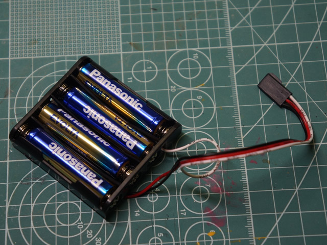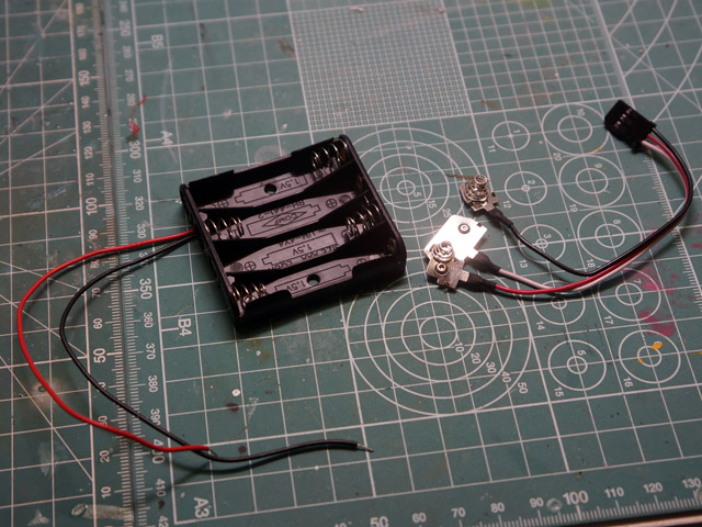 | 左:唯一、タミヤ純正品がないと当初思い、秋葉原で調達してきた単4×4本の電池ボックス 右:タミヤカスタマーで取り寄せた「電源コネクタ」 |