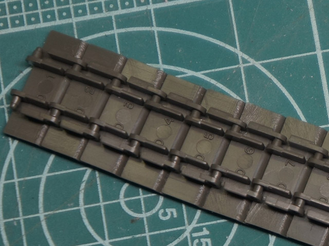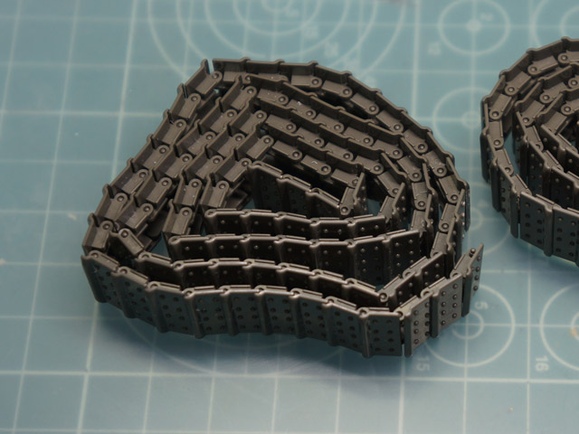 | キャタピラは片側87枚。数えるのが大変だと思ったら、なんと番号が刻印してあります! 21番まであるので、これを4セットとバラ3枚です。予備が10枚以上あります。 |