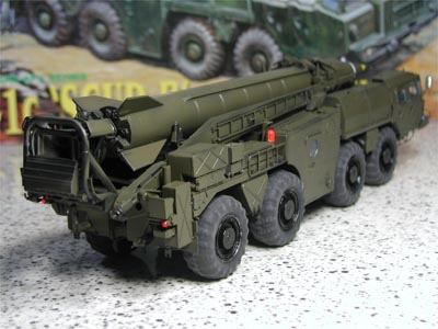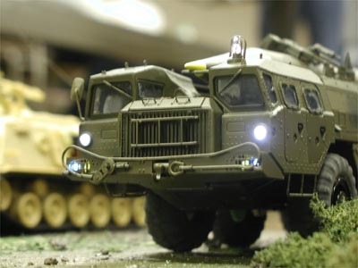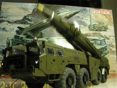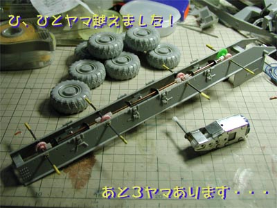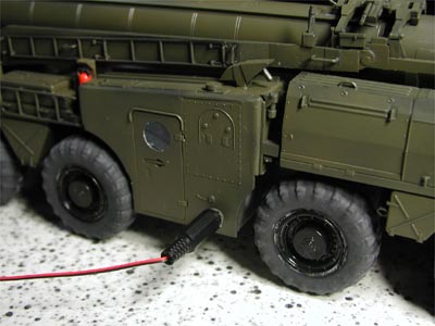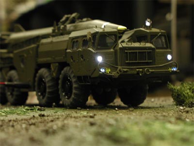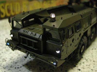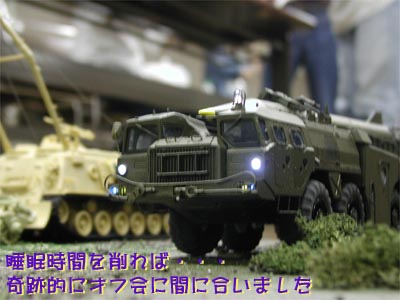 | このキットの製作には色々と考えさせられました(^_^;)。ドラゴンの1/35スカッドBです。 そもそものきっかけは今年9月、「某国の軍事パレードに今年スカッドミサイルが初登場する可能性がある」という情報でした。既にシルクワームミサイルキャリアやノドン、テポドン(国名がわかりますよね)の1/72スケールの模型完成品は用意してあるのですが、スカッドミサイルの1/72の模型はありません。調べてみたのですがインジェクションキットではこのスケールで発売されていないことがわかりました(ARMO社からレジンキットが出ていたことが後日判明)。このスカッドの1/72の模型をよりによって「丸1日で(暴挙)」作ろうという神をも恐れぬ話だったのです。「おそらくボンネットトラックタイプのトラクターがミサイル本体をキャリアに載せてけん引するのでは」という想定のもとに、ミサイル本体をフルスクラッチすることにしました。そこで「図面を引くよりドラゴンの1/35スカッドを見ながら縮尺したほうが簡単」ということで“資料として”購入したのがこのキットだったのです。こういった無理難題の話に頼りになるのが個人模型専門店でして、いつもの学芸大学の「たくみ」におじゃましました。ミサイル先端の円錐部分はこれを削ればいい感じということで「たくみ」の奥様が使用中のマニキュアの瓶のキャップを頂いてしまい、ご主人からは1/72トランペッター社のボンネットトラックまで頂戴してしまいました。100円ショップでちょうどの太さのステンレスパイプを発見して購入し、徹夜でガシャガシャやっていた明け方に「実は10年前のパレードで既に登場していた。某国がその部分の映像を編集でカットして配信していたのだが、つぶさに画像解析すると映っていた。それもドラゴンのキットと同じ純正タイプで、ボンネットトラックでけん引なんてしていない」ことが判明。さすがにドラゴンのキットと同じ物を1/72でフルスクラッチなんて出来るはずが無いので、暴挙もここで無事頓挫したのでした。 そんなわけで手元に大きなドラゴンの1/35キットが残りました(ミサイル本体のみ参考に組み立て済み)。丁度同じ時期に「今年の動く戦車オフ会にはシングルレースでナニを出そうかな〜」と考えており、ハタと目の前にあるキットに目が行ったわけでした。「このままだと、このミサイルだけ組んだ不完全キットは富山ブラックホールへ行ってしまい、2度と日の目を見ない可能性が高いぞ」「まてまて、仮にも“タミヤ”の看板を掲げているのにドラゴンのキットで勝負していいのか?」「最近のドラゴンはそうでもないらしいけれど、このスカッドのキットはよりによって1992年発売なので、単純に組もうとするだけでもパテ埋めの嵐でとんでもないことになるぞ」「そんなキットを動かすのか?8輪駆動?ミサイルも電動で起き上がるのにしたいぞ」「タイヤはゴムではなくて完全なインジェクションパーツだぞ、どうするんだ?」と葛藤は続いたのですが、腹は決まってしまいました。リモコンバトル用のT-10スターリンの完成を待って取り掛かるつもりだったのですが、ことのほかT-10に時間がかかり、取り掛かったのはオフ会の11日前でした(^_^;)。 どのように走らせ、どのように光らせ、どのようにミサイルを起き上がらせるか・・・テキストは無いのですべてが試行錯誤です。通勤時間や食事時間、勤務中でもアイデアが浮かぶと紙に書き留めました。例によって途中経過を毎日TOP画像で更新することにより自分を追い込みました。「あれは撮り貯めた画像を後からUPしているんでしょう?」と何人にも聞かれましたが、掛け値なしのリアルタイム画像でした。でもナニを作っているかわからなかった方が多かったようですね。 オフ会当日の朝4:00に、ようやく無塗装状態で完成。それからつや消し黒で下塗りエアブラシをして乾燥する間に1時間半ほど仮眠を取り、あとは当日の10:00までひたすら塗装を繰り返して、ハンドキャリーで会場に持ち込みました。 |