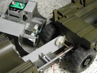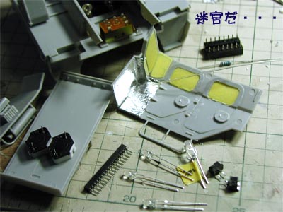 | 「8WD」「電飾」「ミサイル起き上がり」の3大ポイントに「塗装」を加えて合計4つのヤマをいかに乗り越えるか計画を立てたのですが、大幅にスケジュールが遅れました。 「8WD」は当初プーリーで動力を伝えるつもりでしたが、コースにあると噂される急坂(テルスター坂)を乗り越えるトルクに自信が無く、確実に伝えるクラウンギアにすることに変更しました。まさに一つ一つ現物合わせでミニ四駆よろしく作っていくわけですが、ここで小さなミスを発見。ピンク色のクラウンギアは同じ方向に配置するとタイヤが前輪と後輪で逆の方向に回ってしまうんですね、小さなことですが勉強になりました。今回のスカッド可動計画は「超汎用ギアボックス」があって初めて実現した物です。可能な限りコンパクトにまとめながらも十分なトルクがあります。今回は実車のことを考えてさらに2枚のダブルギアで減速させることにしました。こういった位置決めはとてもナーバスなのですが、超汎用ギアボックスはヘッドが動きますので簡単に合わせられます。 実際に走らせるとなると、キットのプラスチックパーツ製のタイヤが大きなネックになります。当初は市販の模型工作用のトラックタイヤが直径がぴったり同じだったので、厚さを稼ぐ為に輪切りにした物を2枚重ねにしようとしたのですが、一つのタイヤを作るのに1時間以上かかってしまうので断念。しかしこの問題も「メディコム」社の「スーパーラバースプレー」という商品で解決しました。簡単に言えばまさに字の通りラバー(ゴム)のスプレーです。メーカーに問い合わせると電話に出た担当の方が「私もまさにプラモデルのタイヤに使っています。スモークのスプレーは4〜5回吹き重ねるといい感じのツヤ消し黒になりますよ」との答え。スケジュールが押してきて、これを使ったのがオフ会前日の夜から当日朝という綱渡りでしたが、結果は素晴らしい物でした。東急ハンズ渋谷店にはありますので皆さんに是非お勧めします(^_^)。 「電飾」には本当に苦労しました。当初はムギ球を使おうと思っていたのですが、東急ハンズで綺麗なLEDを発見。「これは秋葉原のパーツショップに行けば・・・」と考えて早速向かいます。久々に“濃い”体験をしてきましたが、あの空間は本当に侮れませんね。同じパーツが隣のお店で値段が倍になったり、日曜日は一部の店が閉まっていたり、挙句の果てにはウソを言われたり・・・。結局、極小スイッチ類も含めて多数購入し、使わないパーツが続出してしまいました。ハザードランプを点滅させたいのですが、驚いたことに特別なシステムを組まなくても電源を繋ぐだけで自動点滅するLEDがあるんですね(そのミチの方には当たり前かもしれませんが、ワタシとしては「タミヤ自動点滅回路セット」なんかがすり込まれているもので・・・)。しかしこの自動点滅LEDは直径5mm以上の物しかなく、それより小さいものはありません。そこでお店のお兄さんに何気なく教えてもらったのが「簡単だよ、回路の中に5mmの点滅LEDを直列でかませればいいんだ」ということ、目からウロコですよね。これによりテールランプの直径2mmの赤色LEDまで点滅させることが出来ました。本体運転席左右についているウインカーには1mmの光ファイバーを通し、内部に仕込んだ5mm赤色自動点滅LEDに繋げば、極小ウインカーまで点滅します! 当初は3VをLEDの電源にするつもりでしたが、使いたい自動点滅LEDは3.6V以上でないと反応せず、お店で一目ぼれした高輝度LEDも使いたいな〜と考えると電源には9V電池しかありません。そうなると今度は電圧が高すぎるので抵抗で落とすことになります。「すいません、9Vを3.6Vに落とす抵抗を一つ下さい」なんてお願いすると、タカタカと電卓を叩いて「はい、これ、10円」なんて言われるのは嬉しいですね。しかし結果的には大量の(都合10個)LEDを光らせることになり、2V、3V、3.6V用LEDが混在したので、現物合わせで直列、並列を組み合わせて試したら抵抗は使わなくても回路が組めました。オフ会会場では「おお〜!この高輝度LED、高いんですよね〜!1個\1,500くらいするでしょう?」と驚かれたのですが、私が買ったお店では1個\350でした。きっとここ数年で劇的に価格が下がっているのでしょう。自分としては\350というのはとんでもなく高価格と思っていただけに、そんな話を聞くと「安いのかな〜」なんて思ってしまう単純な頭です(^_^;)。 「ミサイルの起き上がり」は構造をいくつもいくつも考えましたが、やはり一番シンプルで確実なテグスで引っ張る方式に決めました。出来てみればなんでもない仕組みなのですが、巻き取りプーリーの位置、減速ギア比、もう一つの超汎用ギアボックスの設置場所など試行錯誤の連続でした。ミサイルが垂直になったところで自動停止させたかったのですが、アイデアも時間もなく、またそもそも電源を置く場所が無かったので外部電源としました。これによりリモートコントロール