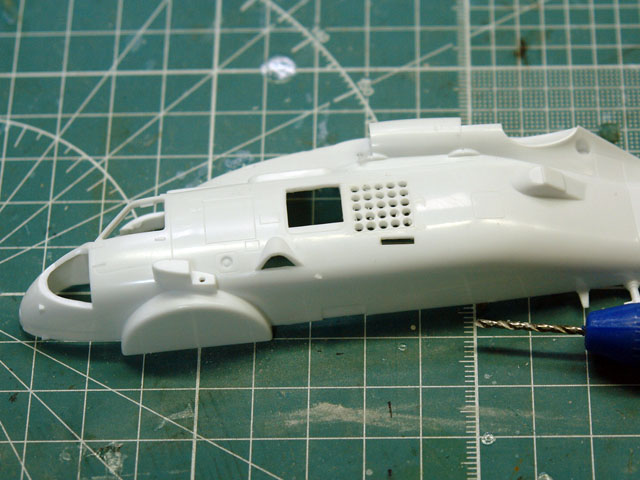 | 左側面にあった25個の丸いくぼみをエポキシパテで埋めるためにドリルで貫通させます |