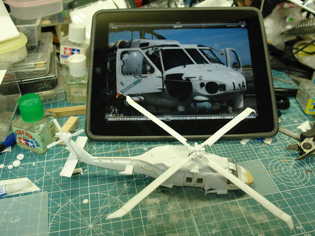 | 当研究室助手の本業が何かは、このサイトをご覧の方の半分くらいはご存知かもしれません。これまである程度普遍的な単語を使って表現してきましたが、今回だけは思いっきり固有名詞が出てしまいますね(笑) 時は2010年7月上旬のある日、「タモリ倶楽部」のスタッフから当研究室助手の携帯電話に直接連絡がありました。 ス:「例によって急な話なんですが、今度横須賀の海上自衛隊で収録をやるんですが、これこれこんなヘリコプターの模型はお持ちではないですか?」 助:「う〜ん、持っていませんが、確か市販品で出ていますよね、なんとかなるでしょう、1週間後ですよね、大丈夫ですよ」 ス:「え!!本当ですか!!じゃあ出演もおねがいしますね!」 助:「あ、出演は別問題ですのでシフトデスクを通してくださいね〜、私個人はもちろん大歓迎です」 電話を切ってから軽い気持ちでネット検索しました。海上自衛隊のヘリのプラモデルでしたら確かハセガワから出ていますので、素組みなら3日もあれば出来るでしょうというつもりでした。「えっと、確かSH-60Kと言ってたよな・・・、あ、これか。で、模型は・・・と、確かハセガワで・・・あれ? え???・・まさか・・・・そんな・・・・(汗)」 そうなんです、1/72スケールクラスで市販されているのは旧タイプのSH-60Jだけで、最新型のSH-60Kは1/700しか発売されていないんんですね。じゃあ改造するしかないなあ〜と思ったらこれが大変、簡単そうに見えてかなり大掛かりで奥が深いのです。幸いだったのはネット上に画像がふんだんにあることなんですが、詳細な図面は見つけられません。さらにどれだけ探してもネット上に1/72の作例もありませんでした。こうなれば俄然張り切ります。こんなメジャーな機体は間違いなく早晩キット化されるから、その前に作ればおそらく世界初の作例だ! となったのでした。 日曜日から作り始めて本番は6日後の土曜日の早朝だったのですが、この時は毎朝3:30出社という早朝の仕事をしていましたので自宅で中々時間が取れませんでした。例によって毎日mixiで途中経過画像をUPして皆さんに応援してもらいながらナントカたどり着きました。ポリパテが乾かなくて最初からやり直したり、エポキシパテの乾燥時間と勝負したりと相変わらずのドタバタでしたが。「厳密に作るのではなく、SH-60Kにしか見えないことくらいを妥協点に」「間に合わせること」がプライオリティーでした。おそらくオンエア上は10秒も映らないと思いますが、その10秒のために全勢力を注ぎました。 何と言っても特徴的なのはメインローターの先端です。先端の角度を10度上半角、20度下半角、50度下半角とすることにより揚力を10%も向上させたとされていますので、ここは外せません。この改造は簡単そうに見えてかなり厄介です。でもそこは道具に頼りました。ヒートペンです。これがあれば自由自在にローター先端の角度を変えることが出来ました。溶けてはみ出した部分はあとで処理ます。この改造を筆頭にエポキシパテなどを使ってどんどん進めていきました。初めてヒートプレスもやってみました。悩むより慣れよですね。この時、いろいろな新しい道具を試しましたが、隠れたヒットになったのはこの年の4月に新発売になったiPadでした。今となってはどなたでも持っているiPadですが、発売と同時に入手しながら今ひとつ有効な使い道を見つけられないでいた(爆)当研究室助手でしたが、ネットで拾った画像をサクサク管理して、簡単に拡大縮小することにより手元資料として大活躍したのでした。 最後の金曜日の夜は限りなく徹夜になりましたが、なんとか完成させて京浜急行で横須賀に向かいました。事前に登録してあったから当たり前なのですが海上自衛隊のゲートを通り広報の方に挨拶したら「聞きましたよ!60K作って来られたんですっって?あれ、市販品にはないんですよね」といきなり言われていまいました。ま、マズイ・・・情報が漏れている(じゃないでしょ)。控室でスタッフにも見てもらいましたが、「お〜!素晴らしい!!」なんておだてられて苦労が一気に吹き飛びます。この時のタモリ倶楽部は「海上自衛隊全面協力 護衛艦たかなみの全て」という回で、前編後編の2回に分けて放送する大作になりました。 現場に行って初めてわかったのですが「たかなみベスト20」というテーマ設定で、その中でSH-60Kを紹介する予定だったのですが、当日の訓練項目にSH-60Kが入っておらず、本物のSH-60Kは木更津の基地にいて飛んでこないことがわかっていたのです。それでナントカならないかとスタッフが思いついたのが私に模型を作ってもらうことだったみたいです。「まあ、世の中にSH-60Kの模型がないとわかった以上、誰も作ったことがないだろうし、アラを指摘する人もいないだろう」との思いは大間違いだったことに現場で気づきました。なんと一緒に出演して解説をしてくださるのは“現役のSH-60Kパイロットさん”“現役のSH-60Kの整備士さん”