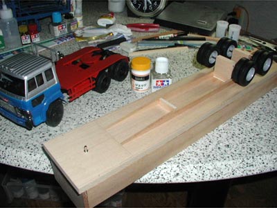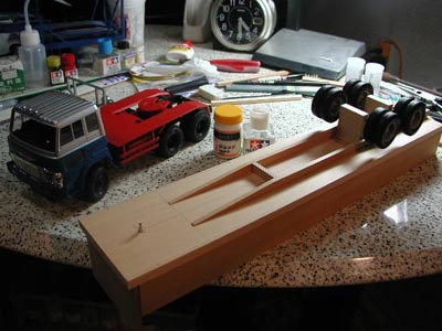 | この日は休日でした。 実は前日の夜から手が動き始め、「基本は簡単な平面構造なのだから木製の板の貼り合せで組んでみよう。東急ハンズへ行けばmm単位で切断してくれるはずだ」との思いから簡単な図面を引き、早速行動に移したのです。合わせて様々な“素材”を東急ハンズで探します。牽引車との接続部分のシャフトは強度と正確さが要求されます。そこで偶然見つけた本棚用の移動式棚板の金属ピンを使ってみることにしました。テールライトや各種ウインカー類は手芸用コーナーでスパンコール状の物を発見。どこにも決まりはないので自由に探しました。 すべて揃えて夕方に帰宅し、早速作業を始めます。まず最初に棚板用の金属ピンをあらかじめ正確に開けてある穴に打ち込みます。1mm小さな直径に開けてあった穴ですが、カナヅチで打ち込むと接着剤も何も使わずにピタリと固定できました。牽引車部分の受け具の直径とも合って、幸先の良いスタートとなりました。 基本は箱組みですので難しいことはありません。極小の10mmステンレス釘で組み立てようとしたのですが、念のため同じ厚さの板の別の部分で試してみると、板の端ではどうしても亀裂が入ってしまい上手くいきません。そこで木工用ボンドのみで組み上げることにしました。補強用の角材を接着して組み上げるとかなりしっかりしたものが出来上がりました。 省略するところは思い切ってやらなくてはなりません。荷台部分のタイヤサスペンションは完全にオミットし、車高だけを正確に合わせて板に穴をあけて接着しました。集中して作業を進めていましたが、気がついたら翌朝の4:30になっていました。 |