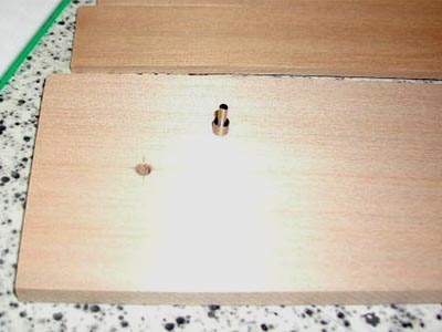 | これが移動式棚板用の金属ピン(見たことありますよね)。 | 小さめの穴を開けてカナヅチで打ち込むとぴったり。 |