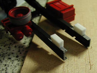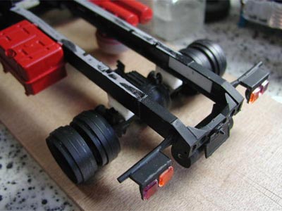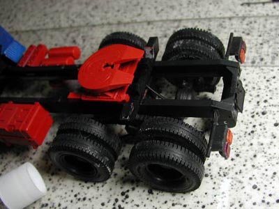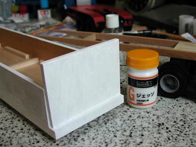 | 今回の荷台のフルスクラッチは加工が簡単なこともあり木の板を使ったのですが、ネックが一つあります。それは表面処理です。 木のハダですのでそのままではどれだけサンドペーパーをかけても表面に小孔があるので、目止めをしなくてはなりません。中学の技術家庭の時間を思い出してもらえれば、「との粉を塗って、乾いたらニス塗り」というのがあるわけですが、今回は“ジェッソ”というものを試してみることにしました。ジェッソとは油絵を描くときなどの下地にキャンバスに塗るもので、炭酸カルシウムとチタニウムホワイトの顔料から出来ているものだそうです。速乾性ということでしたが、念のため1日以上乾かしてからサンドペーパーをかけることにしました。しかし初めて使う物のため薄め具合がわからず、結局原液のまま塗って乾かしたのですが、目地の奥まではあまり入ってくれなかったようで納得のいく結果が得られません。その後、表面にプラ製の角棒のワクを接着していく過程で接着力が極端に悪くなっており、結果的にすべて研ぎ落として溶きパテを塗った後に瞬間接着剤で固めるという、あまりお勧めでない方法をとることになってしまいました。 そしてこの日はもう一つ大技がありました。それはシャーシの切断です。今回のカーキャリアタイプの模型では牽引車の後輪はダブルタイヤの前後2列なので、後輪だけで合計8個のタイヤがあります。しかし今回我々が取材対象にしたのは後輪が1軸のダブルタイヤでした。幸い規格は同じものなので(というより、この手のものは実車の各メーカーのシャーシが共通という話も聞きました)、単純にシャーシを切断して短くすることにしました。余談ですが、このトレーラーの模型を作る半年ほど前に別の事故取材のために同じミツワ社の1/24スケールのダンプカーのプラモデル(モーターライズ版!)も製作したことがあったのですが、今回のトレーラーとシャーシは共通でした。 正確に寸法を測り、カッターのこでバッサリと切断します。新規に1軸となったサスペンションは例によって省略しプラバンの積層で高さだけは調整します。ナンバープレートとウインカー類が付いたシャーシ後部も新たに切り落とし、プラバンで補強します。真っ赤に塗られた天板タイヤハウスも切り落として寸法をつめれば大手術の完成です。 |