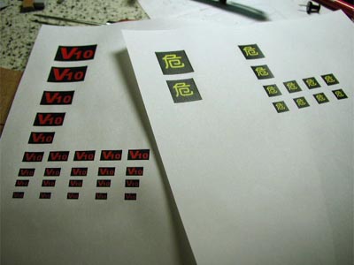 | 前日に作ったヒンジをいよいよ荷台に取り付けます。出来てみるとなんでもなさそうですが、このヒンジは90°に2度折れ曲がっているので3パーツで一つの部品になります。これが左右合わせて42個もあるのですから、合計126個のパーツを正確に位置決めして接着しなければなりません。しかしあせらずにコツコツとやってみると、その甲斐がある結果となりました。 単純作業の後は、また目先を変えた事に挑戦です。既存のキットにはついていなかった危険物取り扱いの「危」マークとラジエターについている「V10」マークをエクセルで作ってみる事にしました。といっても作り方は簡単で、エクセルの枠の中に書体をよく吟味した「危」の文字を書き、枠の中の塗りつぶしを黒にするだけです。大きさは現物合わせにするため、何種類もデータをエクセルシート上でコピーして大きさを変えたものを用意しておきます。この頃はアルプスドライプリンタも持っていなかったので、自作デカールは考えもしなかったのですが、このマークに関してのみ言えばデカールにする必要は無く、実際に普通紙にプリントアウトしました。 |