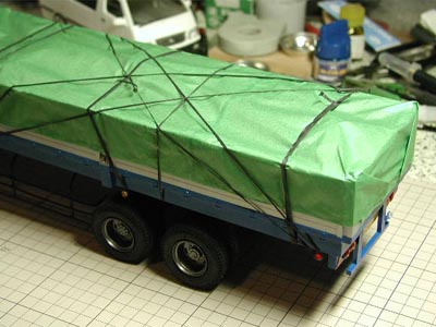 | このトレーラーを作りながら「幌はどうしようかな」とずっと悩んでおりました。おそらく何らかの「紙」素材を使う事になるだろうけれど、果たして何を使えば良いのかと連日頭を悩ませました。 手芸店や東急ハンズの類を一通り見て周り、いくつかの種類を購入してみたのですがどうしても100点満点の素材が見つかりません。しかし、かつて模型飛行機等の主翼に貼った紙をイメージして、ついに色・ツヤともに満足のいくものを発見しました。ただし、なんと30枚セットでの販売です。おそらく今回は1枚ちょっとあれば事足りるのは分かっていたのですが、勢いでセット購入してしまいました。 今回やってみたかったのが幌を止めるゴムベルトです。実物はまさにゴム製のベルトなので、模型でも同じ素材で作ってみる事にしました。一番薄いゴムシートを購入し、金属定規を当てながらデザインナイフで2mmの幅で切り出します。継ぎ足しはお互いにカラ結びで縛ると、結び目が返ってリアルです。調子に乗って何本もつくり、実際に幌(シート)を挟み込むように固定してしまいました。ちなみに荷台の前部には、何かが積んである様に新聞紙で芯を作って入れてあります。 サイドラインのスジ彫りや、荷台前部のはしごや工具箱といった類の物がほとんど幌に隠れてしまいましたが、これは穏やかな心であきらめました。 後日談ですが、この年の「動く戦車オフ会」にこの完成品を持ち込んだところ、ある方から「幌の材質はアイデアものですね!あれって屋台のタコ焼きの上にかけてある紙ですよね。自由な発想が素晴らしいですよね」とのお褒めの言葉を頂いてしまいました(^_^)。言われてみれば、まさにその物の紙質でした。 |