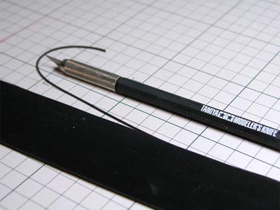 | 極薄のゴムシートをデザインナイフで切り離します。 | ゴムベルトは実際に縛って引っ掛けます。 |