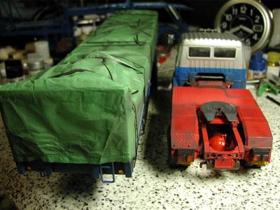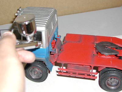 | 「汚(よご)し塗装」・・・。AFV模型を作る人なら当たり前の単語ですが、まだまだ一般に浸透している言葉とは言えないでしょう。しかしイメージは簡単に湧くと思います。そう、AFV(装甲戦闘車両:まあ、平たく言えば戦車のことです)模型ではピカピカの新車のままのような塗装ではリアル感が足りないので、わざと汚れたように塗装をするのです。カーモデルでは一般的にはピカピカツヤありにし、いかに綺麗に塗装するかが勝負で、ラリーカーなどを除けばあまり汚し塗装はしません。しかし今回はトレーラーですので汚し塗装をした方がリアル感が増すでしょう。 汚し塗装の仕方は60年代末に試行錯誤の時代に入り、70年代末頃から様々なテクニックがハウツー本に紹介され、何種類かのやり方が確立されました。薄めたフラットブラック系の塗料をカゲにあたるところなどにエアブラシする方法。ラッカー系の塗料で基本塗装を終えた後、エナメル系の薄めたフラットブラック系の色を全体に薄く塗って拭き取る方法(ウオッシング・スミ入れ)。エナメル系の薄めたダークイエロー系の塗料を筆に一旦含ませ、その筆をティッシュペーパーの上などで何度もこすり、殆ど筆に塗料が残らなくなった状態で模型のエッジ部分を軽くこするように塗る方法(ドライブラシ)などが一般的です。 こればっかりは机上であれこれ考えるより、自分で何度かやってみるのが一番です。当研究室助手は基本にそって上記の3種類をいずれも試してみました。偉そうな事を書いていますが、99年の水モノオフ会のために作った潜水艦ハリバットが生まれて初めてのエアブラシ体験であり、ウオッシングやドライブラシも全くやったことがありませんでした。しかしアーマーモデリング誌のおかげで土居さんや金子さんといったスーパースターに色々と教えてもらえるという夢のような環境で、大いに楽しんでいます。例えてみれば生まれて初めてゴルフクラブを握ったら、タイガーウッズや丸山茂樹に教えてもらえたような物でしょうか?あ、でも別に土居さんや金子さんに手取り足取り教えてもらったわけではなく、試行錯誤する中で「こんなときはどうなさってます?おお、そうするんですか」といった程度で、実際の作例を穴のあくほど見つめて学ぶのが主ですね。 牽引車部分には薄めたフラットブラック系の色を3種類ほど用意して、それらしくエアブラシをします。特にホロの部分は陰になる部分を考えながらエアブラシするといい感じになりました。トレーラー部分のサイドパネルは薄めたエナメル系のフラットブラック系の色を筆でそっと置くと、毛細管現象で勝手に溝を塗料が流れていい感じに広がってくれます。そしてヒンジ部分にはダークイエロー系の塗料でドライブラシをしたのですが、予想通りやりすぎてしまったのが反省点です。 ・・・丸々2週間かかりました。ようやく完成です。 |