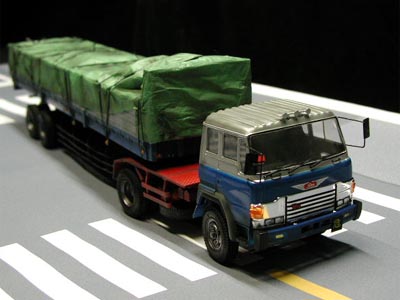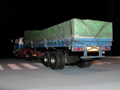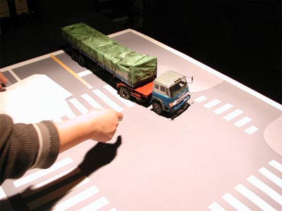| 後日、テレビカメラでスタジオ撮影をする事になりました。 専門の美術スタッフに交差点の正確な寸法のデータを渡し、図面を引いて1/24スケールに縮尺して大型用紙に出力してもらいました。部屋の照明を落とし、念のため周りを暗幕で覆って準備をします。強力な照明の他にスポット光の装置も用意して様々な角度で撮影しました。 今回の大型トレーラーの実車は、荷台部分に最大30tもの重さの荷物を積むことが出来ます。あくまでも一般論ですが、もしも走行中に先頭の牽引車部分が急ブレーキを踏んだとしたら、荷台部分には大変な大きさの慣性力が残っており、前方に飛び出そうとします。この時、牽引車部分のハンドルがほんの少しでも左右どちらかに切られていたとしたら、トレーラー全体は「く」の字型に折れ曲がるようになって転倒してしまいます。この「く」の字型に折れ曲がる様がジャックナイフに似ているので「ジャックナイフ現象」と呼ばれるのです。文章で書かれると、頭を使いながら想像をたくましくして考えないと理解できないこの現象も、模型を使えば簡単に表現できます。 交通事故がどのようにして起きたのかは、現場に残された道路のスリップ痕、キズ、残された事故車両の損傷具合をつぶさに解析することで判明します。目撃者や当事者の証言はもちろん大切で重要です。しかし一切の主観が無い、物言わぬ証拠こそが真実を語ります。「現場に残された傷跡はウソを言わない」が、気骨の交通事故鑑定人・駒沢幹也氏の口癖です。 あくまでも趣味の世界の延長にすぎなかった今回のプロジェクトですが、事故の真相解明にひとかけらでも貢献できたとしたら、こんなに嬉しいことはありません。模型製作日記という一点で進めてきた今回の一連の更新ですが、最後になりましたが、事故で亡くなられた一人の青年への追悼の気持ちをお伝えし、結びとさせていただきます。 |