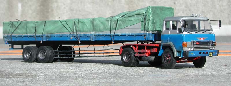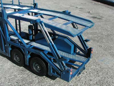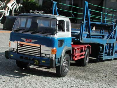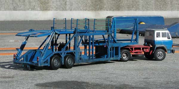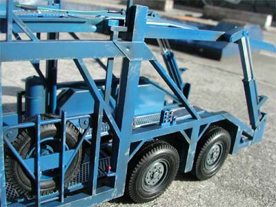 | トレーラーのフルスクラッチをしてからほぼ1ヵ月後、カーキャリア部分が素組みのまま放置されていたので、再塗装し、ディテールアップする事にしました。 キットの組み立て説明書上でも最上部にワイヤーを張る指定をされていたのですが、当初の実験の時はそれもオミットし、塗装も缶スプレーの1色で、「汚し塗装」もしていませんでした。そこで一気に仕上げて屋外で撮影しました。 余談ですが、牽引車とトレーラー部分はご両親の元へ渡りましたが、このカーキャリア部分は他の自動車模型同様、交通事故鑑定人・駒沢幹也氏に永久に預かっていただく事になりました。 |