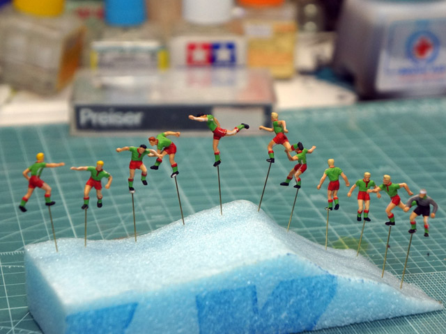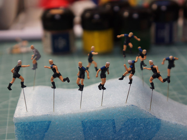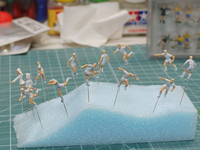 | まずは足の裏にピンバイスで穴を開け、0.4mm真鍮線を差し込みます。 この時点でバリやパーティングラインを処理し、キーパーのベレー帽も削ります。 |