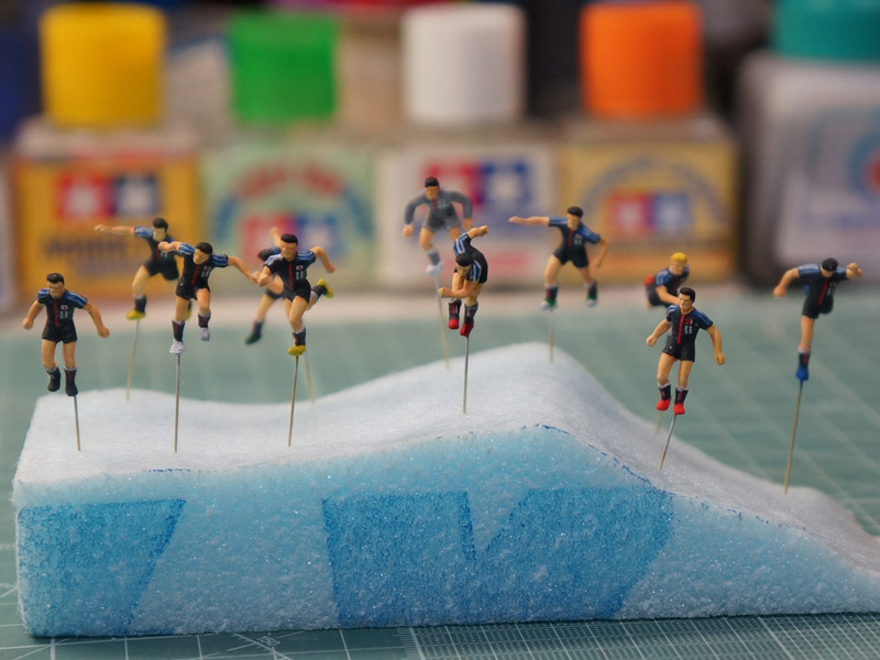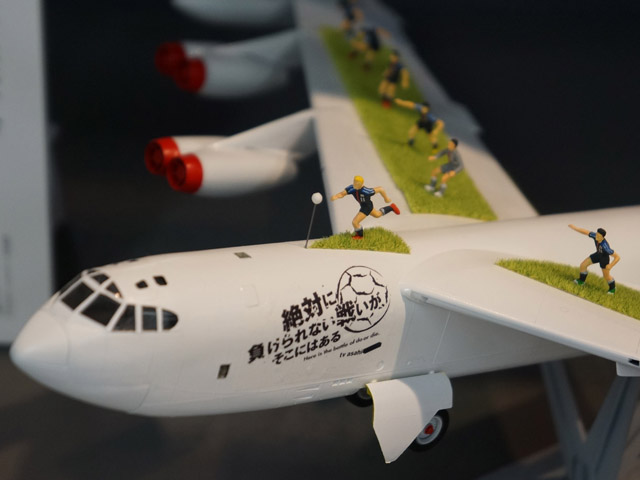 | いよいよFIFAワールドカップ2014が始まりますね!4年に一度の祭典、大いに楽しみ、応援しましょう!! 日本がブラジル切符を手にしたのは2013年6月4日。ちょうど1年前ですね!0-1でリードされていた後半44分、絶体絶命の状況で日本はPKを得ます。蹴るのはもちろんこの男「本田」。彼はこの状況で右でも左でもなくど真ん中に蹴ってゴールネットを揺らしました。日本中が鳥肌が立った瞬間でした。 こんなしびれる展開になるとは思ってもいませんでしたが、当研究室助手は1年前のこの試合の2日前にこの作品を完成させ、facebookに公開していました。市販されている完成品フィギュアと勘違いされた方も多かったみたいですね。 リペイントしたフィギュアをもう一度ケースに収めて、ハイ完成!としたのですが、ちょうどその1か月後に池袋東武タミヤモデラーズギャラリーで、私が所属する「ろうがんず」のテーマが「1/100ミニジェット愛コンプリート展」となったので、B-52を2機作り、こんなファンタジー作品を作ってみました。 本番もみんなで応援しましょう!! (2014/06/03) |