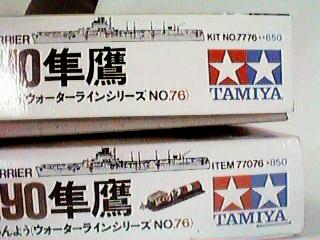 | 上の箱は通常のWLシリーズ(タミヤ)の「隼鷹」である。下の箱が問題の「隼鷹」で何故かモーターと電池受けの絵が追加されている。 よくよく見ると右肩のタミヤのマークの上の"KIT No"と"ITEM"となっており微妙に違っているところがちょっと怪しい。 中身を見ると驚いたことに船底と一体成型された赤色の船体が入っているではないか!他のパーツはほとんどオリジナルタミヤのキットと同じ構成になっているが、エッジが甘いなど精度はオリジナルに比べてかなり劣る。 船体を見ても下の写真のように、水線下の形状は実艦とは大きく異なり、深さも浅い。 さらに驚くべきことに箱の底にはマルイのスーパーサンマルシリーズに入っている厚紙製の展示台と同じ物が入っているのである。 このキットミンダナオ会のK会員がワンダーフェステバルにて購入してきたとのことであるが、何から何まで謎なキットなんである。 海賊版だとしてもなぜ「大和」とかのメジャーな艦ではなくて「隼鷹」なのか?ひょっとしたら世界のどこかでは日本のWLシリーズをどんどんモーターライズ化している海賊メーカーが存在するのであろうか? ヒントとしてはランナーの刻印に「1992」と記されていること。そして付属の接着剤に怪しい漢字が印刷されている(どうも新字体ではないようだ)ことである。 このキットについてもし詳細をご存知の方がいらっしゃったら 私まで御一報いただければ幸いです。 |