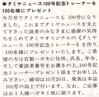 | とか何とかいいながら、なんだかどこか引っかかるよなあ...と思いながら、調べ始めてみると...「あ!」...冷や汗タラ〜な情報を発見してしまいました。 なんとタミヤニュースVol.106(1981/03)に「タミヤニュース100号記念トレーナー、ご希望の方に特別価格¥2500でお分けします」の記述があるではないですか...ご丁寧に写真まで載せて...私は何を見ていたのだろう...。苦しい言い訳としてはこのVol.106が発行されたのは1986年の2月ですから、丁度受験のために上京し、まさに真っ只中で...いかにも苦しい...「タミヤニュースの世界」の編集で、どこを見ていたんだ... 確かに後に販売はされましたが当初は100着限定のプレゼント品であった事実は歴然と残り、販売に関しても何年間も売られていたとは考えにくく、レアなモノであることに変わりはありませんが、一人はしゃいでしまったことを反省しております。どなたかに指摘される前に自分で見つけられたことがせめてもの救いですが、自戒を込めて前の文章は削除せずに、しばらくはこのままにさせていただきます。(きっと「何言ってるんだよ、ここに売ってると書いてあったよ」と思っていた方が全国に何人もいらっしゃったんだろうなあ。恥ずかしい...) (2001/05/27) |