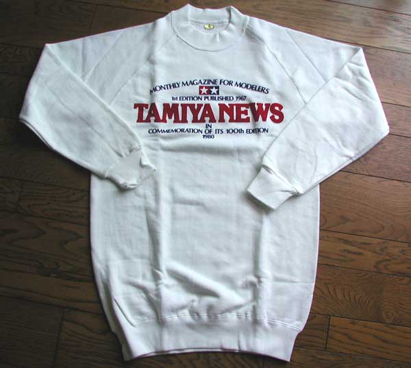 | 「タミヤニュースの世界」発売日記念です。ちなんだ物を紹介しましょう 1967年1月号の創刊以来、タミヤニュースは1980年10月号で通巻100号を数えました。実質月刊誌になったのが1979年。100号までは殆ど隔月誌扱いだったので13年もかかったのですね。そこで読者プレゼントとして記念トレーナーが作られました。 正直申し上げて、この告知を当研究室助手は原体験としてあまり覚えておりません。時期を逆算してみると、大学受験まっただ中の高校3年生の秋だったことが判明しました。人生で一番勉強していた時期に、とりあえずタミヤの最新情報だけはと見ていた程度ですので記憶が薄いのでしょう。 そんな中、今回の「タミヤニュースの世界」の編集過程であらためて新製品案内のページを調べていくと、Vol.100にこの記念トレーナープレゼント告知記事を確認したのです。「えっ!こんなのがあったの!?」というのが正直な感想です。しかしよくよく読んでみると、全国でたった100人にしか渡らない超レアな非売品です。さらに「ご応募はお1人様ハガキ1枚に限ります」と書いてあるではないですか! こんな厳しいプレゼント品がかつてあったでしょうか?捜そうという気力も萎えるほどの衝撃です。しかし、「タミヤニュースの世界」という本を出版するに当たってこの100号記念トレーナーの写真があると無いではマニアの方々の満足度が違うだろうなあと思うと、当選者として只一人公開してある福島県の清野さんという方を104の電話番号案内で捜そうかと考えたほどです。念のため静岡のタミヤ本社にも在庫の確認をしたのですが「残ってないですねえ」との返事。そもそもタミヤニュースの文字告知原稿しかないのでどんなデザインかさえわかりません(それもそのはず、当選者が決まってもこのトレーナーが完成していなかったのですね)。正直、あまりにもレアすぎるのできっぱりとあきらめました。 月日は流れ「タミヤニュースの世界」用のタミヤグッズの撮影も終了し、すべてのカラーページのレイアウトも終えた4月中旬のある日、当研究室助手は某インターネットオークションのサイトをチラチラ見ているときに「え?」と固まってしまいました。そこには小さなサムネイル画像でタミヤマークの見たこともないトレーナーが出品されていたのです。 出品物の名前は「タミヤ スウェット サイズL 未使用品!!」。品物の状態についての説明はありますが、そもそもこれはタミヤの“何の”トレーナーかといった記述は一切ありません。はやる気持ちを抑えて画像を拡大すると、そこには“TAMIYA NEWS COMMEMORATION OF ITS 100th EDITION”の文字が読みとれるではないですか!!!うぁあああああああああ!!%#!§ &!!!... 落ち着け、落ち着け...と気を引き締めて、入札の作戦を考えます。しかし答えはすぐに出ました。どうしても欲しい!だからすぐに入札だ!!(全然落ち着いてないですね)。結果的に合計3人の争いになりましたが、意外にも一人はハンドルネームや過去の履歴から見て若い女性。もう一人もオークション初心者で過去の履歴はマフラーや靴を買っている人。そう、タミヤ製品を過去に落札している人はいませんでした。そしてとてもリーズナブルな金額で落札決定!(○倍以上の金額を入札していたのはヒミツ)。カラーページの締切は終わっていましたが白黒ページの画像の締切が3日後です。出品者にお願いしてトレーナーを直接ネスコに送ってもらい、写真撮影して滑り込ませました。ちなみに最大の疑問を落札後に出品者に問い合わせたのですが、出品者は古着屋さんで、どこから入手した物かわからないとのことでした(この説明が一番納得する選択肢だったかもしれません)。 (2001/05/25) |