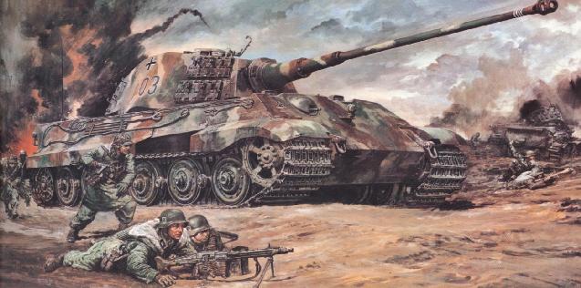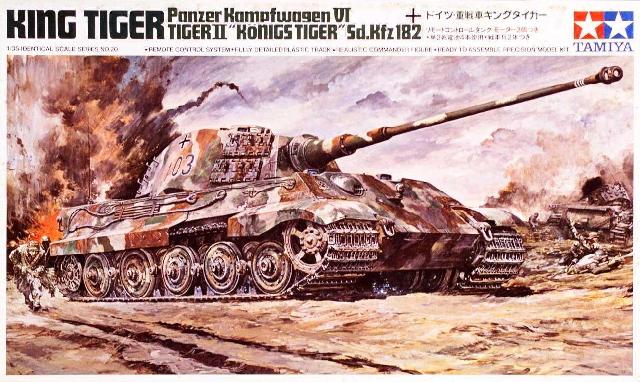 | ・手前のマシンガンを撃つ兵士など3体削除 ・その代わりに3本の溝が地面に加わる ・車体全体迷彩塗装の変更 ・ターレットナンバー「814」→「103」 ・ターレットナンバーの色も黒に ・スプロケットホイルが18枚歯の試作型(および後期型)から9枚歯の標準型へ ・バックのKV−1がクロムウェルへ、黒煙も追加 ・師団マークの変更 ・前方機関銃の描き込み ・ボッシュライトの描き込み ・コマンダーズキューポラの形状変更 ・砲塔にベンチレーターの追加 ・砲塔上部フックの長さが短くなる ・ペリスコープにガラスが入る ・後部アンテナの角度、バックの黒煙の表現方法の変更 ・キャタピラの浮き具合の位置 ・補助キャタピラは変更無し 少なくとも15ヶ所の変更点があるのは驚異的で、画伯の意地(?)も感じられます。資料の質と量が現在とは比べ物にならないほど不足していた当時に「ボルトの本数がわからないと絵に取りかからない」と同業者に言われる程細部にこだわった(本人は謙虚に否定してらっしゃいますが)画伯のこと、過去の作品の誤りはどんなに小さな物でも修正したかった、と言うより直さないと購入者に失礼だと思ったそうです。 まず最初に目につくのは、手前の3体の兵士が削除された事です。もちろんキットにはこの3体の兵士は元々入っておらず、タミヤからの要請が伺えます。しかしこのボックスアートの構図から考えても兵士の削除はなんとも惜しく、代わりに3本の轍(わだち)が描き込まれました。新資料により迷彩塗装の色も変更され、車体ナンバーも史実に基づいて修正されました。 スプロケットホイル(起動輪)は試作タイプの18枚歯の物が描かれていましたが、標準タイプの9枚歯に直されました。これはキットに合わせた物で、当初は18枚歯でキット化され、キット自体がマイナーチェンジされて9枚歯になったので(キットナンバーもMT220→MT246に変更)、こちらも修正されました。しかし砲塔に付く予備キャタピラは、初版のキットが試作型のキャタピラだったにもかかわらず、ボックスアートは当初から標準型でした。 バックで燃えている車両がKV−Tからクロムウェルに代わったのは「だってキングタイガーの88mm砲に撃たれたのなら、もっと激しく壊れた方がいいと思って」だからだそうです(永遠のヤラレキャラですなあクロムウェルって)。そう言えば燃え上がる黒煙もKV−Tよりかなり多くなってます。 車体上部の描きこみは当時画伯が足で稼いだ新資料に基づくもので、入念にチェックされより正確になっています。前方機関銃のMG34も通常型と車載型の違いを描き込んであります。意外に気づかないのはキャタピラの垂れ下がり具合まで直してある事です。手前の3体の兵士を削除された事により躍動感が消えがちなところを、スプロケットホイルが回転して前進中のキャタピラのテンションを考えての描き込みです。当時、走行中のキングタイガーの写真は日本で一般に公開されておらず、これなどは博物館の写真を見ただけでは決して描けないもので「実際動くとどうなったか?」にこだわった高荷画伯の真骨頂といったところでしょう。 ここに非常に興味深い作品を紹介しましょう。それは1972年に発売になった画伯初の戦車作品集「電撃!ドイツ戦車軍団(主婦と生活社)」のキングタイガーです。これは基本的にタミヤとニチモのキットのボックスアートを主体にしながら、戦車の上部構造物(OVM)や部隊編成まで高荷画伯が一人でイラストを使って解説した力作です。普通、模型メーカーに作品を納入すると、基本的に原画は作者に帰って来ない為、修正しようと思っても出来ません。作品集の出版といっても、過去の作品をそのまま載せるのが普通と思われる中で、画伯はタミヤから一旦作品を預かり加筆修正をします。これは時期から言って大箱と小箱の中間にあたり、前方の3人の兵士はそのままなのにスプロケットホイルやターレットナンバーが直っています。ここからもタミヤ側の事情ではなく作者側でより正しい絵を出版したいという意図が伝わってきます。余談ですが、この時砲塔キューポラに対空機銃架が追加して描き込まれたのですが、小箱になる時にはキットに入っていないという事で再び削除されてしまいました。 |