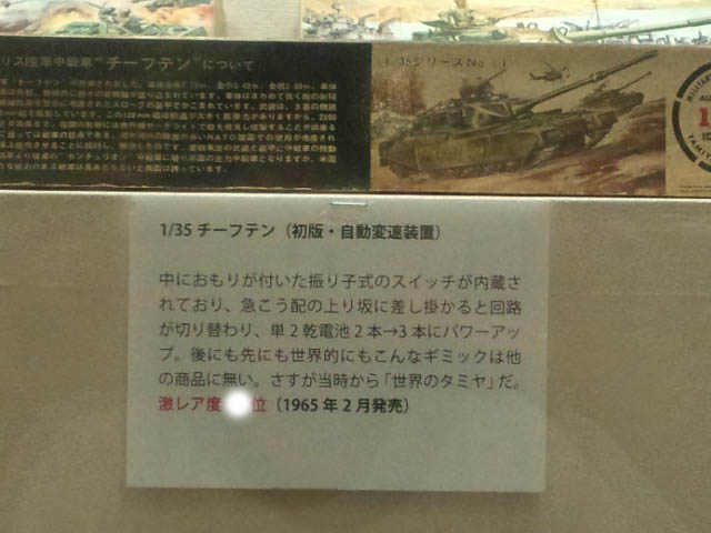 | そんな中ですが、静岡ホビースクエアの許可を頂きまして、私のタミヤコーナーのキャプションを公開させていただきます 限られたスペースにタミヤ愛?を詰め込んだつもりですが、いかに貴重なものかを楽しんでいただこうと 「勝手に激レア度おねがいランキング!」しました。 それぞれの展示物はいったい何位とされているのか?実物も含めて現地に行ってご覧ください。 静岡ホビーショー期間の5/17(木)〜5/20(日)は時間を拡大して展示しています! (2012/05/12) |