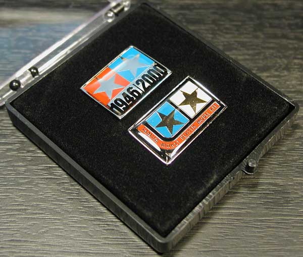 | お待たせしました。「田宮模型全仕事」全3巻を購入し、昨年末までに応募券を3枚貼って送って下さった皆さん、ついに特製ピンバッジの発送が始まりました!ご覧のように専用ケース入りで、予告通り新ロゴ・旧ロゴの2個セットで近日中にお手元に届くはずです。クロームメッキの本体がエポキシ樹脂でコーティングされており、キズがつきにくいうえに高級感もそのままです。写真では照明の関係で旧ロゴの右側の黄色がうまく出ておりませんが、実物は鮮やかな山吹色です。限定1600セット!大切にして下さい。 そして合わせて次のプロジェクト「タミヤニュースの世界(仮題)」が発表になりました! (2001/03/01)) |