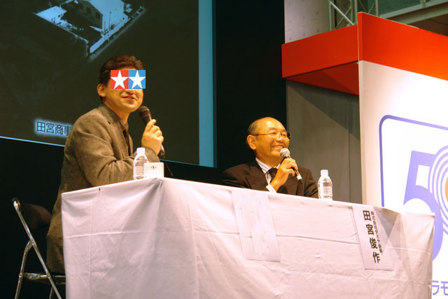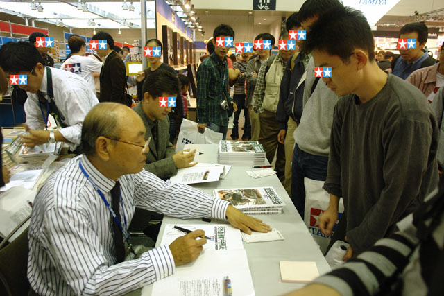 | 2008年10月18日、幕張メッセで開かれた第48回全日本ホビーショーの一般公開日初日。今年は国産プラモデル誕生50周年ということで様々なイベント盛りだくさんとなりました。 その目玉イベントのひとつに「田宮俊作会長が語る〜模型50年」というトークイベントショーがあったのですが、畏れ多くもその司会に抜擢されてしまいました。思えば、この田宮模型歴史研究室Webサイトを勝手に立ち上げて10年、以前では全く考えられなかった事が次々と起こり、大袈裟ではなく私の“人生”も変わりました。もちろん素晴らしい方向にです。トークイベントショーは1時間のお約束だったのですが、次に同じステージではイベントがないことに甘え、20分もオーバーしてしまいました。台本は殆どないアドリブでしたが、お客様にも喜んでいただけたでしょうか?個人的には今年の始めにタミヤフィリピンを見学させて頂いていたことが大きく、タミヤの今後の方針についてスムーズに会長のお話を引き出せたかなと思っています。 実はこのイベントの事前打ち合わせで田宮会長から「あの本のサイン会をやりましょうよ」と提案され、「えっ?でも発売されて4ヶ月近く経ってますし、普通の本のように安い価格じゃないですから、そう売れるもんじゃないですよ・・・」と答えたのですが、「何とかなりますよ、やりましょう!オイ!本は会場に何冊届いているんだ?」となってしまいました。 結局、トークイベントショーのあと、タミヤブースにて即席のサイン会が開かれることになりました。正直、嬉しいよりも当惑というのが本音でしたが、予想に反して多くの方に並んでいただき、目の前で飛ぶように売れていきました(購入していただいた方、この場を借りてお礼申し上げます。ありがとうございました)。ワタシの怪しげなサインもどきのあと、隣に座った会長が筆で丁寧に自分のお名前を書き、朱印まで押していらっしゃいます。「もう何回“模型少年のアガリ”になったんだろうな〜」との思いを強くしました。 会場では国産プラモデル誕生50周年ということで、各模型メーカーが元気です。話題の新製品も数多く展示されました。また特設イベントも日本プラモデル工業協同組合で開催された物、個人で開かれた物など趣向が凝らされ、来場者数も前年を大きく上回ったそうです。 (2008/10/28) |