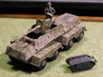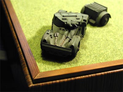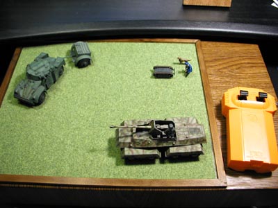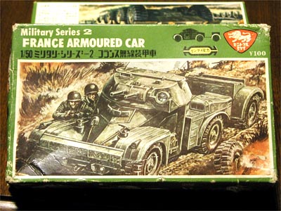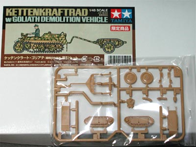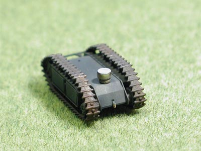 TAMIYA」展の全国5大都市での開催など、これまた激動の1年だった西暦2002年。その締めくくりに向かう11月は1週おきに“3大イベント”目白押しとなりました。恐ろしいことに、そのすべてに当研究室助手は参加してしまいました。 11月16日(土) 静岡タミヤフェア「RCタンクオーナーズミーティング」 11月24日(日) 東京AFVの会 11月30日(土) 動く戦車オフ会2002 ご存じない方の為に念のため。「東京AFVの会」というのは実に四半世紀以上の歴史を誇る、日本で一番歴史のある装甲戦闘車輌モデラーの、年に一度だけ開かれる集会です。主体となった「カンプグルッペジーベンの会」から続々と生み出される創造力にあふれた作品の数々は、今でも伝説になっているほど素晴らしいものばかりです。当研究室助手は少年時代から雪深い北陸の田舎でただただ呆然としながらその会の様子を、タミヤニュースに載るレポートで眺めておりました。呉光雄、十川俊一郎、熊谷徹、金子辰也、山田卓司といった模型少年にとって憧れの大スターが参加する会は、まばゆくキラキラ輝いておりました。昨今の助手の周りの環境の変化で、なぜかそのほとんどの方とお知り合いになれてしまった今も、「東京AFVの会」は畏れ多く神聖な会という意識は全く変わっていません。現在においても何の技量も持たない当研究室助手にとっては全くもって敷居の高い崇高な憧れのイベントなのですが、主催者でもある十川俊一郎氏の人柄に甘えて、数年前から不定期に駄作を持参しながら参加させていただいております。 今回の課題テーマは「ミニスケール(1/35未満)」です。丁度1週間前に参加した静岡のタミヤフェアで、会場限定先行発売されていた1/48ゴリアテを入手していたので、これを組み立てて持っていこうかなというのがベースでした。しかし静岡のタンクミーティングに参加したメンバーの反省会(という名の当日帰京した足での目黒焼肉飲み会)で自分の口から出た言葉(後述参照)を実行してしまうことになっていくのです。 まず考えたのは「締め切り6日前から作り始める上に技も無いんだから(ホント絶望的かつ失礼な話ですよね)、歴史的な絶版キットを組んでしまうという得意の作戦しかないだろうなあ」ということでして、幻のセントラルモケイの1/50ミリタリーシリーズを傍に並べることにしました。 セントラルモケイ・・・ライオンのロゴマークのこのメーカーについては既にプラモデルの王国のねこにいプロダクツさんが紹介なさっています。それにによると、ゼンマイギミックにおいての国内トップクラスのメーカーで、そのモールド(造形技術)の良さも一目おかれるところがある優秀なメーカーで、得意分野は自動車模型で、航空機やSFガンもラインナップにもありました。今回作った1/50ミリタリーシリーズは1960年代末期から1970年代初頭にかけて発売されたようで、シリーズNo.3まで発表されました。No.1が「ドイツ重装甲車Sd.Kfz.234」、そしてNo.2が「フランス無線装甲車」という、現在の目で見てもなんともマニアックなラインナップです(本当に売れたのか心配になってしまいますね)。そしてNo.3にあたる「イギリス戦車輸送車」は私の周りで発売を確認した人がいません。これが発売されていたとしたら、かなり大きなキットになっており大変な話題になっていたと思うのですが、どなたかご存知でしたらご一報をお願いします。1960年代末にタミヤが先行して作り上げた「動くスケールモデル戦車ブーム」に同スケールの1/35でニチモ、日東が追随するなか、セントラルモケイは一回り小さな1/50スケールで得意のゼンマイ走行というギミックを持って参入してきたのです。 いつもながらのことですが、製作塗装に当たっては技術的には何らお見せすることはありません。「ドイツ重装甲車Sd.Kfz.234」に関してはひのきさんの“初心者のためのコーナー”のエレファントの塗装方法を見ながらのナンチャッテ塗装。「フランス無線装甲車」についてもこれまたひのきさんの“ソビエトSU-85”の塗装方法を大いに参考にさせていただきました(ありがとうございます)。いずれも砲口だけはピンバイスで開けてあります。 そして本題のゴリアテですが、21世紀のタミヤの技術にあらためて唸らされる凄いキットです。パーツはなんと5個しかないので、あっという間に完成します。塗装して驚いたのですが、一体成型のキャタピラ表面にうっすらと彫ってあるモールドが浮き上がってくるではないですか!金型の抜きの方向から考えると信じられません。早く一般販売が待たれるところですね。 そもそもどうしてゴリアテを作ろうという気になったかと言うと、「あの小さなゴリアテを動かすんだよ!」という静岡反省会での助手自身の問題発言があったからでした。1/48スケールですと車体の実寸は3cmに満たないのです。いかに実車も有線遠隔操作だからバッテリーは外でいいといっても、転輪とキャタピラが一体成型ですから、これをまともにモーターで