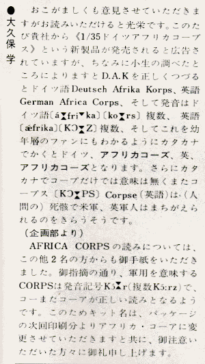 | ミリタリーミニチュアシリーズは1973〜74年に第一次ピークを迎えます。その核となったのは、なんといってもドイツ88mm砲だと思われますが、これに合わせてかアフリカ戦線のジオラマがブームになりました。マチルダ、土のうセット、砂漠のネズミとアイテムが充実してきて、ドイツ兵がNo.8のアフリカ軍団セットだけではなあと思っていたところに登場したのが、このキットNo.37「アフリカ・コープス」です。 リアルタイムですぐ購入し、イギリス第8軍砂漠のネズミと白兵戦?のジオラマを作りながら「長ズボンの人は暑いだろうなあ」なんて余計な事を考えていた小学生に、定期購読し始めたタミヤニュースの声の欄に衝撃的な投稿が飛び込んできました。それはVol.47(1974/9月号)の大久保氏の投書です。 「そ、そんな...タミヤが間違えるなんて...」ローマ字しか読めなかった当時の小学生にとって、CORPSはどう見たってコープスです。発音しない文字があることの方がおかしいと思ったものの、タミヤもあっさりと謝ってます。いたたまれない気持ちになるとともに、当時のファンのアカデミックなところに畏敬の念さえおぼえたものでした。 そんな訳でこの「アフリカ・コープス」はわずか半年程しか発売されず、すぐに「アフリカ・コーア」に替わってしまいました。「これはこの箱は大切にしなきゃ(困ったものだ)」と作り終わったアフリカ・コープスの空箱を大切に保管していたのに、なにを思ったのかこの箱を切り取って壁に飾ったりしてしまい結局紛失してしまいました。そんな訳で25年近く探していたのですが、半年程前に千葉のさるお店で発見しました(初めて入った店で、なんの期待もしていなかったのに、ドアを開けた瞬間にビッと来るものがあり、これを発見して凍り付きました。アフリカ・コーアと同じ扱いだったようです)。 ロンメル、スコーピオン、スパイダーなど確信犯的に名前を変えた物を除けば、これがタミヤの最初で最後のキット名のミスだったのではないでしょうか? |