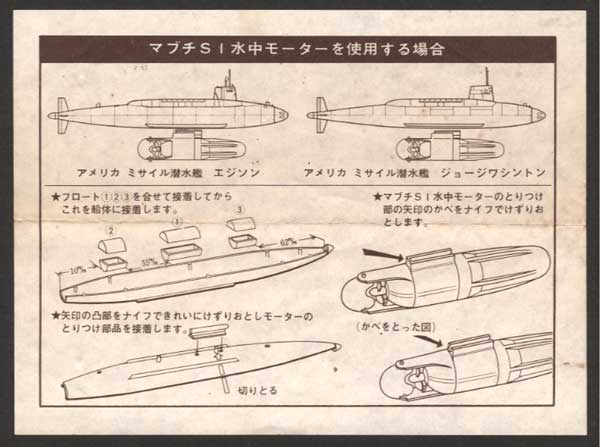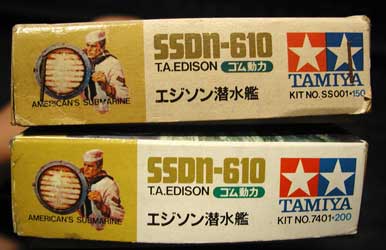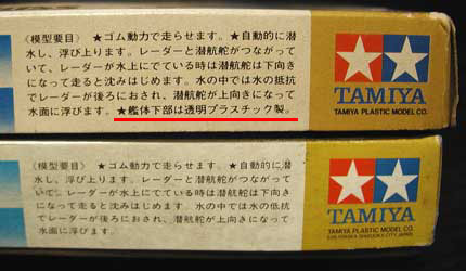 | と、これで一件落着かと思ったら、潜水艦といえばMcCoyさんからメールを頂きました。ありがとうございます! 「3代目は150円だったはずですので、81年の3代目改の200円というのは値上げではないでしょうか?」 あら?そういえばそうですよね...と改めてゴソゴソやると、こまごまとしたことが色々とわかってきました タミヤの値上げはオイルショックを挟んで何度かありましたが、大きな値上げは1974年1月でした(第4期に突入)。3代目の発売がその直後の1974年3月で150円となれば、常識的にこの150円という金額は1979年11月の値上げ(第5期突入)まで保たれたと考えられます。一方、肝心のこの3代目はいつごろまで製造されたかを考えると、先に述べたように1975年版カタログ(1974年10月発行)の巻末リストに、値段表記はないものの載っているということは1975年夏までは販売されたと考えるのが普通で、少なくとも3代目は2年間は売られていたことになります。そして3代目改の告知に当たるくだんのタミヤニュースVol.111に「思い出の」という表現が使われるということは少なくとも直前の2〜3年間は製造されていなかったことが予想されます。この2〜3年前という期間に第5期突入の1979年11月が含まれるので、3代目改で初めて200円に値上げされたというのは十分説得力を持つことになります。そう思ってあらためてつぶさに3代目改の組み立て説明書を見たら、「8105(81年5月 )」の文字が小さく印刷されていました。 さらにこの潜水艦のバージョンの歴史とタミヤの住所の移転が微妙に絡み合っていることがわかってきました。3代目改の発売はは1981年5月ですが、前年の12月に恩田原に移転しているにもかかわらずボックスサイドの住所表記は小鹿628のままなんですね。さらにこだわれば3代目は小鹿50−1で発売されましたがその半年後に小鹿628に移転しているので、厳密には1975年夏に発売された「3代目」は“小鹿628、150円”のはずですが、そうなっていないはずです(もし、どなたか所有なさっている方は一報下さい)。 さらにこのエジソンのボックスサイドには3代目には「艦体下部は透明プラスチック製」という表記があるのですが、3代目改ではこの1行が削除されています。しかしなんとハリバットに関しては3代目改でも透明鑑底であったことが判明しました。しかしこの潜水艦はエジソン、ワシントンといった動力ゴムを艦内に置くタイプと、動力ゴムが艦体下部にむき出しになるハリバット、グレイバックに分けられるのですが、本来見えなくなってしまう巻き具合を外から確認できるという画期的なメリットがあったエジソン、ワシントンが透明艦底では無くなるのに対し、あまり意味を持たないハリバットがかたくなに透明にこだわった理由がわかりません。グレイバックの3代目改はどうなっているのか興味深いのですが、残念ながら富山ブラックホールに保管してあるためすぐには確認できません。 そういえば初代から2代目に変わるときに、過渡期として初代の箱に「マブチ水中モーター使用可能」のシールを貼って対応したものがあったことも判明しております。箱の中には「水中モーターを使用する場合」という別紙が追加されました。少年プラ模型新聞広告によりますと、そもそもTKKマブチS−1が発売されたのは1967年3月です。この直後にタミヤは対応したことになるのですが、初代からわずか1年後ということもあって箱替えまでは間に合わずにシール対応したと考えるべきでしょう。そうなると新パッケージである2代目の発売はいつか?この特定はかなり困難かと思われましたが、灯台元暗し、タミヤジュニアニュースVol.3(1968/05)に記述を発見しました。まさに新パッケージの装丁写真とともに、「今年から新しいパッケージで登場し人気を集めています」の文章があるではないですか!現在完了進行形の表現や水モノは3月頃から発売された当時の慣例から考えると、ズバリ新パッケージである2代目の発売は1968年3月!と言い切れるでしょう。 久々に豪快(?)な歴史研究にいそしんだと思いながら、「そういえば田宮模型全仕事3にはどうなっていたんだっけ?」と見てみると、ちゃんと“2代目の発売は1968年3月”としっかり書いてあるではないですか...(-_-;)。この本のキット発売時期特定は当研究室助手がすべて監修しておりますが、いったい私は今回何を見ていたのでしょう?良〜く胸に手を当てて考えてみると、そういえばあの時ジュニアニュースを調べていたかすかな記憶が...確かに田宮模型全仕事の発売時期特定は膨大な資料との戦いの激務でしたが、自分のやったことを忘れてもう一度調べていた私って...。 ここまで読んできた方ではっきり理解できた方は一体何人いらっしゃるでしょう?表にまとめてみるとようやくすっきりしました。つまり大きく分けて潜水艦は5種類あるんですね。キットNo.の表記にも3種類あったことが確認されております。