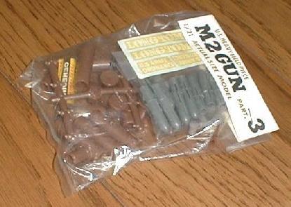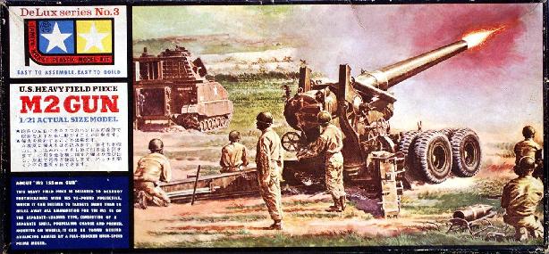 | 当研究室でついに取り上げた1/21デラックスシリーズのトップバッターはキットNo.3のM2GUN、通称ロングトムです。衝撃的なデビューだったことは想像に難くないNo.1のM4シャーマン、今もマニア垂涎のNo.2のM40ビッグショットに続くこのキットは、ビッグショットの大砲部分に大型の10個のタイヤを伴った砲台基部を新規に加えたものです。 No.1のM4シャーマン(リモコンが先に発売されました)のボックスアートは小松崎茂画伯だったのに、ビッグショットとこのM2GUNは違います。特にこのM2GUN初版のボックスアートは記録写真からそのまま構図を持ってきたのではと思われる程リアルなものですが、作者は平野光一画伯です。 世の中がモーターライズ全盛に向かっている時に出された本格的「ディスプレイ」キットですから、これこそが1/35ミリタリーミニチュアシリーズの元祖と言っていいかもしれません。1963年発売当時の価格¥600は決して安い金額ではありませんが、十分に見合う内容を持っています。部品総数がなんと231点もあり、初版のビッグショット同様このM2GUNもアルミパイプの砲身を持ち、弾丸が発射(!)出来ました。 今でこそ1/35に別売りで正確にテーパーが刻まれたアルミ砲身というのがありますが、35年前にアルミを使った複合素材キットだった大きな理由はやはり弾丸をスムーズ発射させる正確な筒であることだったのでしょうか。この弾丸発射ギミックは現在の目で見ても本当に素晴らしいもので、発射後は薬莢が分離し、別のバネ仕掛けで排出されます。砲身の上下左右動もウォームギアも使ったギアの組み合わせでハンドル操作出来ました。キットの箱を開けた時にこの金属ギアが多数見えますので、一瞬モーターライズキットかと錯覚してしまう程です。 キット完成後も8個のタイヤからなる前部車輪や2個のタイヤからなる後部車輪をジョイントピンで取りはずす事が出来ますので、射撃姿勢や牽引態勢も容易に再現できます。 この弾丸発射ギミックは1966年に入り残念ながら削除され、黒箱から白箱に変わり、新進気鋭の高荷義之画伯のボックスアートで黒丸タミヤの中期ロゴキットとして生まれ変わります。そしてここがタミヤの良心だと思うのですが、発射ギミックを削除したということで、定価を¥600から¥500に下げるのです。弾丸パーツとスプリングだけではとても¥100にはなりません。この分は赤字だと思うのですが... はからずもモデルグラフィックス最新号99年4月号にこの初版キットを紹介させていただきましたが、今後も皆さんの協力の下、研究を進めてまいります。 |