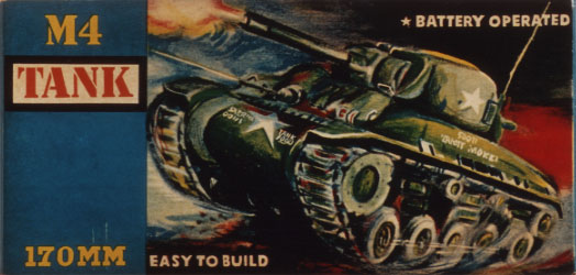 | 20世紀の内にこれだけは押さえておこうというわけでもないのですが、禁断の木製キット第2弾「M4TANK」です。実は完成品を保存しているという画像付きメールが大ベテランのsasakimdさんから当研究室に届き、ご本人の許可を頂いて急遽UPとなりました。 昭和30年代前半、タミヤは木製可動戦車模型のNo.1メーカーとして続々と新製品を発売しました。キャタピラを持ったキット名で見ますと「戦車」「雪上車銀嶺号」「ブルトーザー」「R−C戦車」「中型戦車」「無反動砲SS3」「レッドストーン」「エリコン」「タイガー牽引車」ときて満を持して登場するのがこの「M4TANK」です。「田宮模型全仕事1」の編集段階では静岡の田宮模型歴史資料館に完成品があるもののみを取り上げましたので、ここに名前が挙がったもののすべてが紹介しきれていないことをご了承下さい。先の「中型戦車」では正直、“誰でも作れてちゃんと動く”ということが画期的な時代です。「中型戦車」とあるように車種を特定していなかったわけですが外箱にはM4A3E8シャーマンの写真を使っていました。このM4を(型式は違いますが)3年の月日を経て再現したのがこの「M4TANK」です。プロポーションのすばらしさは早速完成写真をご覧下さい。 sasakimdさんによると「車体前面と後部の一部、転輪を“へたに”改造した」そうですが、当時の白黒完成写真と比べてみるとその苦労が忍ばれます。当時2台(!)購入し、技術が上がってから作った方を残しておいたそうです。ドライバーズハッチまわりの造形や前面の曲面表現、砲身先端の加工など見事です。モーターは指定のものより強力なTKK35、電池ボックスはオリジナルとは違います。この「M4TANK」はモデルとしても走行性能も良く傑作だったそうです。 しかしプラスチックモデルの黒船は既に国内の一部に到達しており、この数ヶ月後の1958年12月には初の国産「総プラスチック製完全模型」マルサンのSSN−571ノーチラス号が発売になるのです。それでもタミヤは戦車模型のジャンルでも木製にこだわり続け、1年後の1959年9月に「スターリン戦車」を、そして自らプラスチックモデル「大和」を出した後の1960年9月に「T34TANK」を発表し、ついに木製戦車模型の歴史に幕を下ろしました。タミヤ初のプラスチックモデル戦車「パンサータンク」の発売はさらに1年後の1961年12月でした。 |