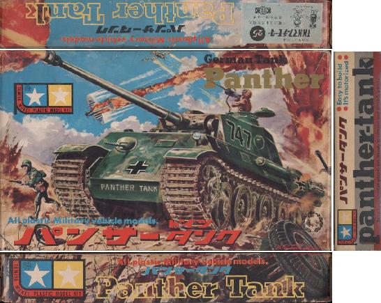 | 何事も節目は大切です。2000年の絶版キット研究スタートはこのキットしかないでしょう。伝説としてはあまりにも有名になったパンサータンクです。 木製キットメーカーからプラスチックモデルメーカーに転身を図った第一作「大和」が惨敗し、まさに後が無い状況での起死回生大ヒット作になりました。このキットが無ければ今のタミヤはどうなっていたのでしょう?当時、他社で既に発売になっていた戦車キットとしては、実質上初めてまともに「走る」キットとして大歓迎されたニチモのパットンなどごく少数で、確実に「動く」ことを大前提に企画されたこのパンサータンクは口コミで評判が野火のように広がったと聞きます。偶然ですがギア比の設定が他社よりわずかに速めに設定されていたこともあり、当時の戦車競技会では参加車輌の90%がこのパンサータンクのこともあったとタミヤニュースVol.11(1968/09)に記述があります。ところで「田宮模型の仕事」で俊作社長が小松崎画伯にボックスアートを頼むくだりがあり、小松崎画伯の第1号ボックスアートがこのパンサータンクと思っている方も多いと思いますが、実際は第1号は木製キット「大鳳」で次に「ぶらじる丸」、「スカイワゴン」と続き、4作目がこのパンサータンクです。原画サイズは縦352mm、横354mmとほ ぼ正方形でボックスサイドにまで絵が広がります。 箱を開けると厚紙のタグに誇らしげに「完全スケールモデルですから立派な卓上置物にもなります」といった記述があることからも、試行錯誤ながらも強力なプライドがあったことが伺えます。しかし当時はパットンやシャーマンが人気で、パンサーはおろかタイガーさえまともに認識されていなかった時代にこの戦車をわからせるのは大変で、その補足としてインストの前文に詳細な説明があり、子供達は「強力な火力と装甲を持ってシャーマンを威圧」「第二次大戦における最も優秀な中型戦車」の文章に胸を躍らせました。思えば第一作からこの様に詳細なキット解説があったことも、その後のこのシリーズの大成功につながっていったのではないでしょうか。 このキットの歴史的意味を考えれば、「ここが実際とは違う」、「この長さがおかしい」といった類の議論はナンセンスなのはわかってもらえると思います。このキットのどこにもスケール表記が無いのですが、1/35スケール戦車シリーズNo.1であることはもちろん事実です。そのあたりについてはスコーピオンの項目を参照して下さい。ところで車体前方上下に2つずつある丸い膨らみは、ギアが干渉しない様に裏側にへこみがあるためです。かつて某漫画家がプラモデルを参考に戦争マンガを描いたときに、この膨らみまで描いてしまったのは有名な話ですね。しかしこれも当時の絶望的な資料不足や漫画家の殺人的スケジュールを考えれば、我々に興奮を与えてくれたことを感謝されこそすれ、なんら揶揄されるものではないでしょう。 歴史的なキットだけに、既にいくつかの雑誌でボックスアート等は公開されていますが、ここでは点滅装置について触れてみましょう。このキットは軽快に走るだけではなく、砲身先端につけた赤色豆ランプを点滅させて走るのです。今でこそリレー回路等も安価で手に入りますが当時の原理はこれまた子供にもわかりやすいものでした。インストの車体下部イラストをご覧下さい。ギアボックスから出るシャフトに円筒状の物がついており、さらにそこから2本の突起物があるのがわかると思います。この2つの突起物がその下にバネ状に付けられた点滅板に回転と共にカチャカチャ接触し点滅装置(ギアボックス自体に電流が流れる!)となるのです。回路図を見ると、電源は動力部のON、OFFとは無関係に常に1.5Vが通電されているため、戦車の止まり所が悪ければ赤いランプが点滅せず、ついたままだったのでしょうか?どなたか原体験のある諸先輩方教えて下さい。 このキットの成形色はダークグリーンが標準と考えられますが、当研究室にある完成品のパンサータンクはジャーマン(フィールド)グレーの成形色です。これも「ジャーマングレーバージョン」と銘打たれたわけではなく「当時の材料の入荷状況で(俊作氏談)」色が変わった事もあったようです。余談ですが昨年末に出版された「ちびっこ広告図案帳/オークラ出版」という1965〜1969年の少年雑誌広告をまとめた素晴らしい本に、No.23(MT223)のパンサーの広告について「広告では緑色に見えたのに実際はダークイエローでがっかり」という筆者の体験が書いてあります。これについて筆者は「当時発売されたばかりのタンクカラースプレーのオリーブドラブを吹いて広告写真にしたのでは」という仮説を立てていらっしゃいます。これをタミヤに確認したところ「まあそんなところでしょうか」と言われたそうですが、当研究室助手も仮説を立てさせていただくと、「テストショットの成形色が単にオリーブドラブだった」と考えます。これについては