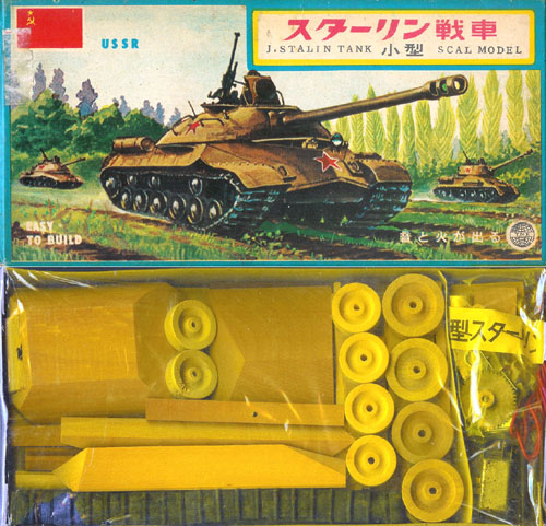 | 久々の更新です。一口に久々といってもここ数年は拙作画像の公開が主でしたので、本来のメインコンテンツである絶版キットの歴史研究としては、なんと2002年3月のアポロ1号以来、いやこの時は追加更新ですから、純粋な絶版キット研究としては2001年9月のブリティシュファントム以来5年ぶりというとんでもない事になっています。 言い訳になりますが、歴史研究は決して怠ってきたわけではなく、アーマーモデリング誌において毎月連載記事として続けており、発表の媒体がWebから雑誌に変わったと認識していただければ幸いです。このアーマーモデリング誌の連載も丸8年目に突入しており、「いつ総集編が出るの?」と良く聞かれるのですが、土居スーパーバイザーも「当然やりますよ」が常日頃の口癖ですので、そう遠くない日に実現するのではないでしょうか? そんな5年ぶりの更新のお題目は、木製戦車「スターリン戦車(小型)」です。時は昭和34年(1959年)秋、都会の一部では高額な舶来品のプラスチックモデルが流通し始め、前年の昭和33年12月には日本初のプラモデル(潜水艦ノーチラス号)がマルサンから発売されたこともあり、日本国内メーカーも急速に木製模型→プラモデルへと向かい始めた年でもあります。毎回お伝えしているように、木製模型のトップメーカーでもあったタミヤはその転換に乗り遅れており、この時期に新製品として発売したのが木製模型スターリン戦車です。 ところで、表題にある「小型」とは何でしょうか?それは文字通り「小型」なのです。木製スターリン戦車が発売された後に、同一アイテムで一回り小さな木製模型として発売されたのがスターリン戦車(小型)なのです。標準サイズのスターリン戦車の発売時期は日本模型新聞の広告により1959年9月と特定されていますが、小型サイズの方は発売時期が特定できていません。1959年9月25日付の日本模型新聞には標準サイズのスターリン戦車の広告に「模型では唯一の赤い星の戦車です」とあるので、小型の方がこの後になりますね。 今回紹介するのは、発売当事に作られたと思われる完成品です。工作、塗装ともに大変高い技術を持った方の作品であることが良くわかりますね。キットは薄い箱に入っていますが、組み上げるととても大きな物になることもわかります。 この木製スターリン戦車(小型)の完成品は、静岡のタミヤ本社歴史館にもありません。私が知る限りではこれまで雑誌などにもカラー画像で紹介されたことは一切無いはずです。ほぼ半世紀前のタミヤの“熱い思い”を是非味わってください。 (2006/05/07) |