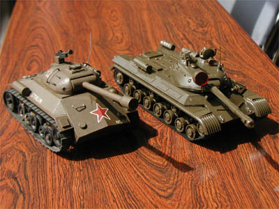 | 奥の緑の車体は“標準サイズ”のスターリン戦車 | 一回り大きく、さらに腰高なシルエット。 |